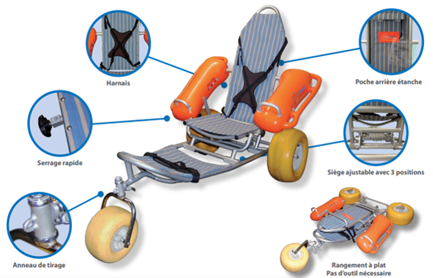 הכיסא מצויד בגלגלים רחבים ובתכנון המאפשר תמרון קל בחול ובמים רדודים. בנוסף, ניתן לשימוש גם עבור ניידות באזורים עירוניים ושבילי פארקים. הכיסא מאפשר לאנשים עם מוגבלויות לשמור על אורח חיים פעיל ולהשתתף בפעילויות חוץ עם המשפחה והחברים.